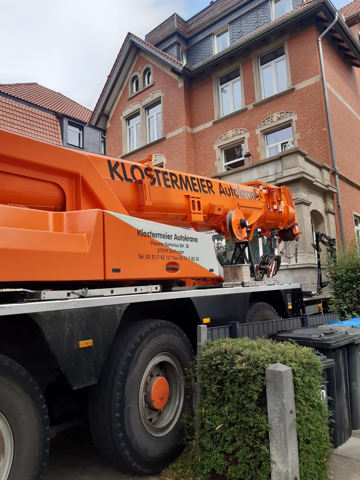Bild 1: Schon die Einfahrt des riesigen Kranwagens auf das Grundstück in der Reinhäuser Landstraße 55 war Milimeterarbeit. Die Mitarbeiter der Kranfirma Klostermeier haben dies meisterhaft geschafft! Nicht nur Musiker sind Künstler, sondern die Beherrschung so eines großen Wagens und die Einpassung millimetergenau auf das Grundstück ist ebenso eine wahre Kunst!