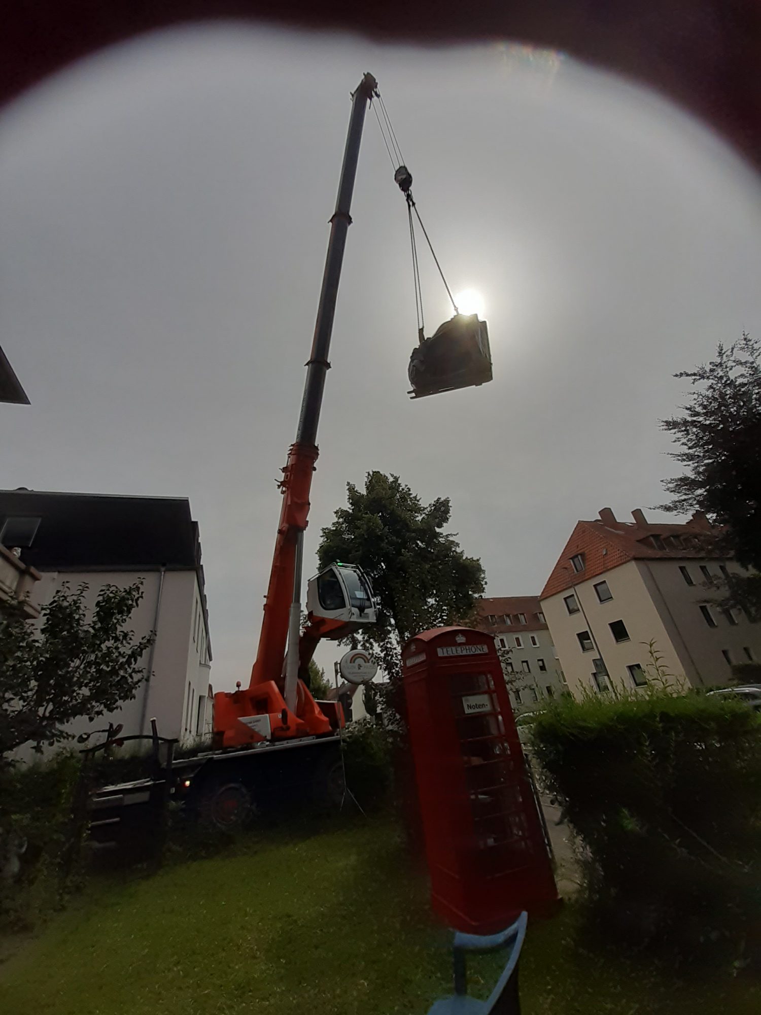 Bild 2 : Es erfordert viel Fingerspitzengefühl und eine große Erfahrung mit der Gewichtsverteilung innerhalb von diesem 400 kg schweren Instrument, damit es in der Waage schwebt und sicher unten ankommt. Ein Lob an die Mitarbeiter der Fa. Kromm, die seit mehr als 25 Jahren solche schwierigen Aufgaben für uns bewältigt!