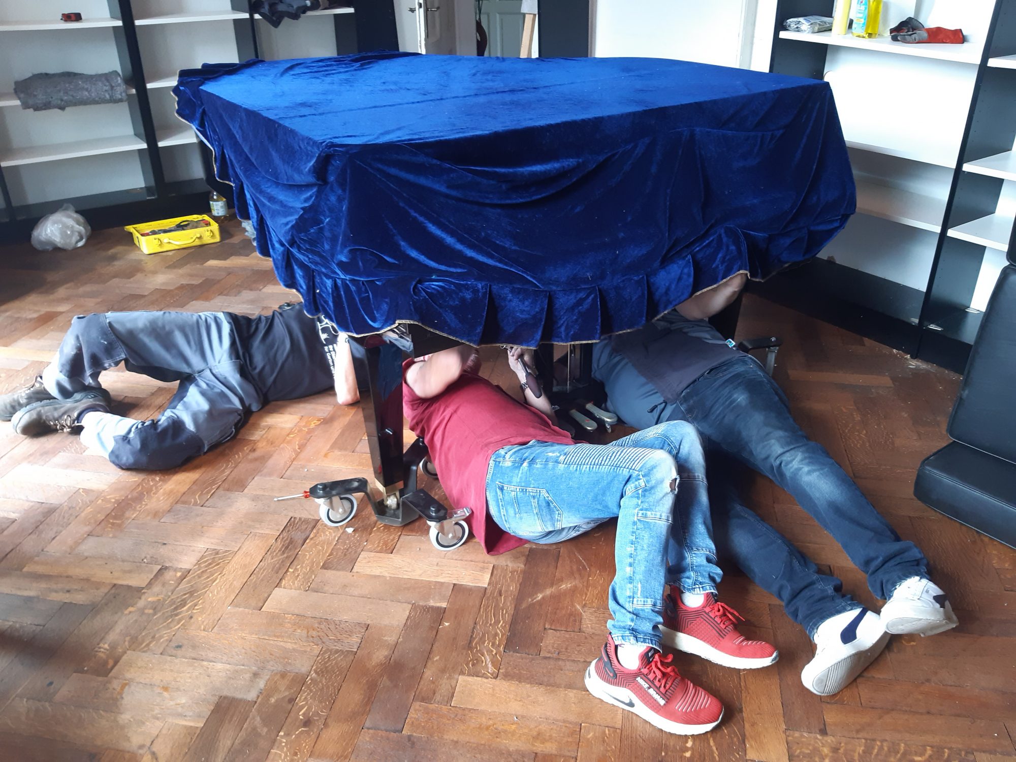 Bild 4 : Der neue Flügel kriegt wieder Beine. Mit sicheren Griffen und dem richtigen Werkzeug sorgten die Mitarbeiter der Fa. Kromm dafür, dass der neue Flügel sicher auf seinen Beinen steht und hoffentlich wieder 25 Jahre und noch länger Schüler auf ihm virtuos spielen, klimpern, ausprobieren, improvisieren und einfach Spaß haben dürfen.