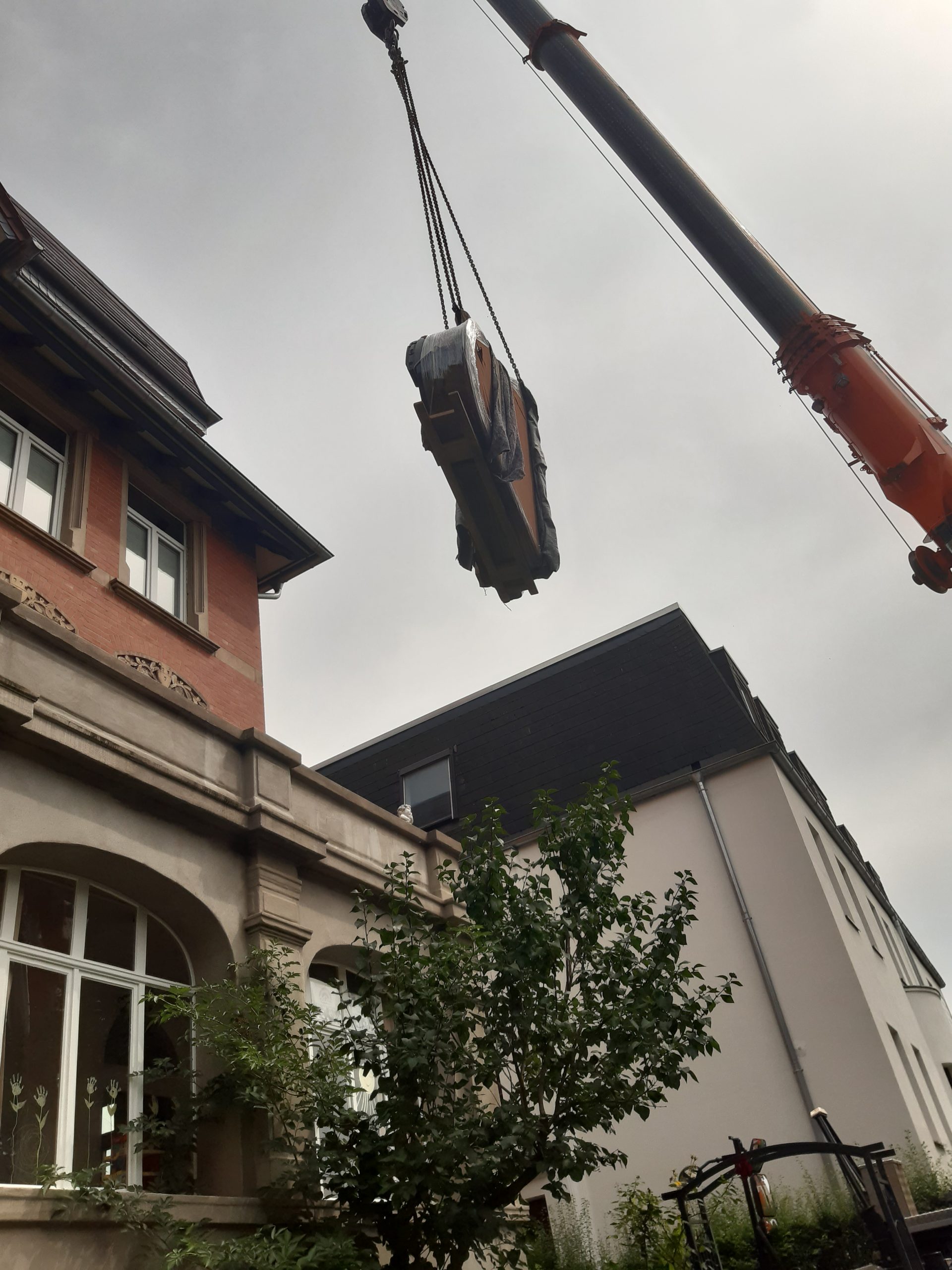 Bild 2 : Es erfordert viel Fingerspitzengefühl und eine große Erfahrung mit der Gewichtsverteilung innerhalb von diesem 400 kg schweren Instrument, damit es in der Waage schwebt und sicher unten ankommt. Ein Lob an die Mitarbeiter der Fa. Kromm, die seit mehr als 25 Jahren solche schwierigen Aufgaben für uns bewältigt!