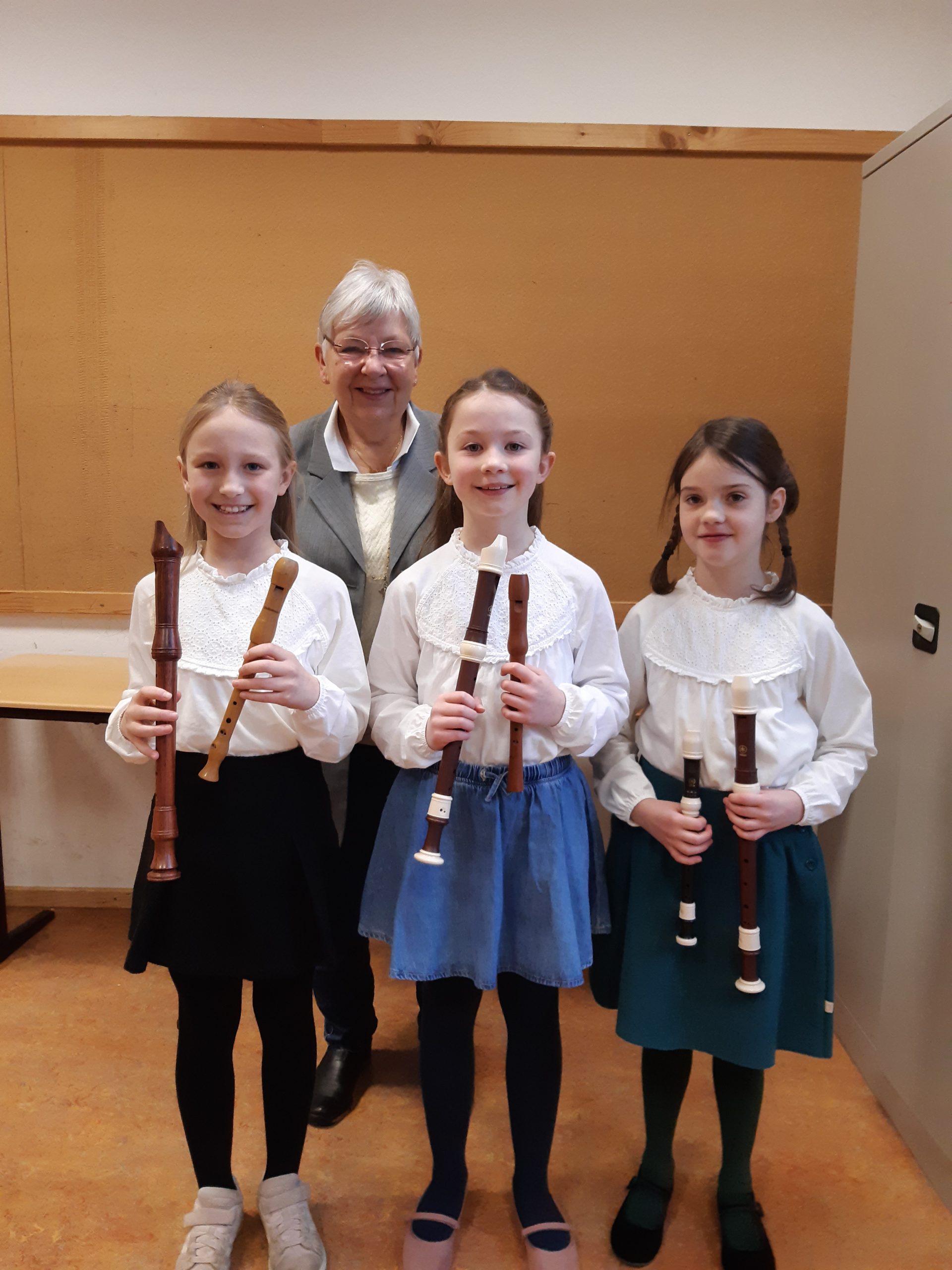 Martha Lockmann, Mathilda Goldstein und Anna Luise Hendrich (Altersgruppe 1B) freuen sich gemeinsam mit ihrer Blockflötenlehrerin Christine Büttner über den 1. Platz mit 24 Punkten.